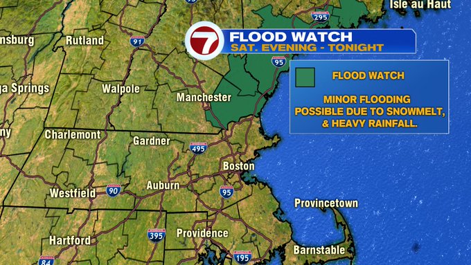 Ahead of the soaking rainfall tonight, a Flood Watch has been issued for the NH seacoast and portions of southern Maine due to snowmelt coupled up with the heavy rainfall, there could be some ponding on the roadways, so exercise some caution through your Saturday evening travels.