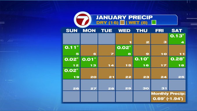 As for the rainfall, we do need the rain. So far this month, we’ve seen nearly 0.7″ of rainfall, which is nearly two inches below normal. And there’s no denying that we are much warmer this month, since we’ve seen two 70° days…we’re at least 8° above normal so far this January. With the recent temperature swings, January has felt more like spring (almost March-like) than the middle of winter.