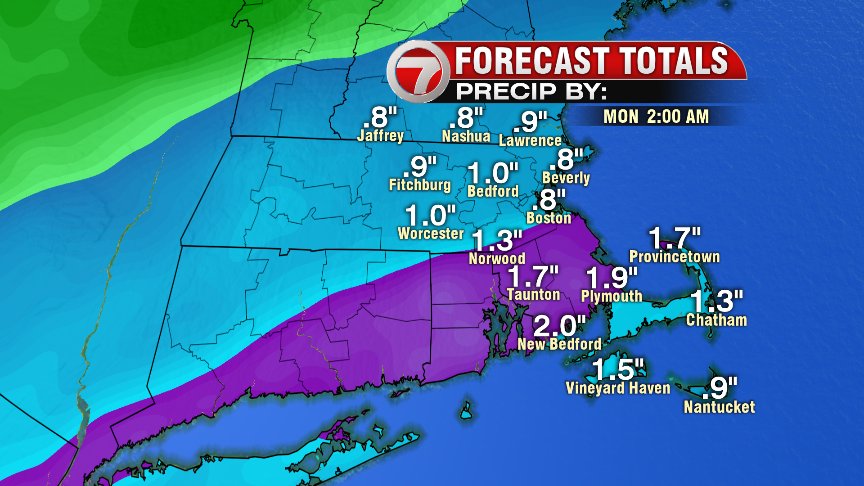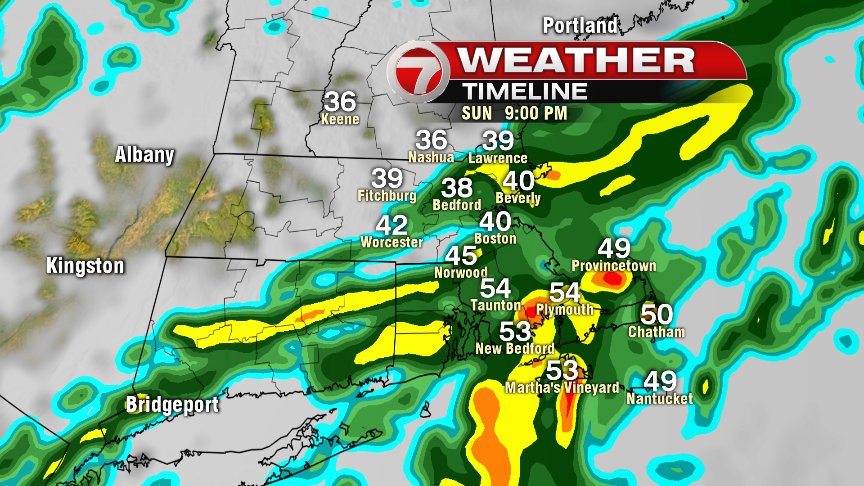 While the rain this morning has generally been light to moderate, we’ll likely pick up the pace of intensity at times midday-evening as scattered downpours enter the mix. Expect 1-2″ of rain to fall with localized street flooding a possibility in these embedded downpours that form. The highest risk to see that would be in Southeast Mass where the Flood Watch is in place.