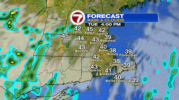 The day starts gloomy with fog/mist, and it’s chilly in the mid 30s. It gradually starts to clear up around lunch time, and we begin to see a few peeks of sun. By 3-4 PM, most towns are partly sunny. Highs reach into the mid 40s inland, and close to 40 at the coast with an onshore breeze.