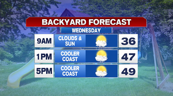 It doesn’t look like we will have a full day of sun Wednesday, but I think we’ll take any sun we can get. Most of the day has a mix of clouds and sun. The morning starts chilly in the mid 30s, and then it gets into the mid 40s by lunch time. Highs reach close to 50º inland, and close to 45º at the coast. It’s looking like a good day to let the kids play in the backyard.
