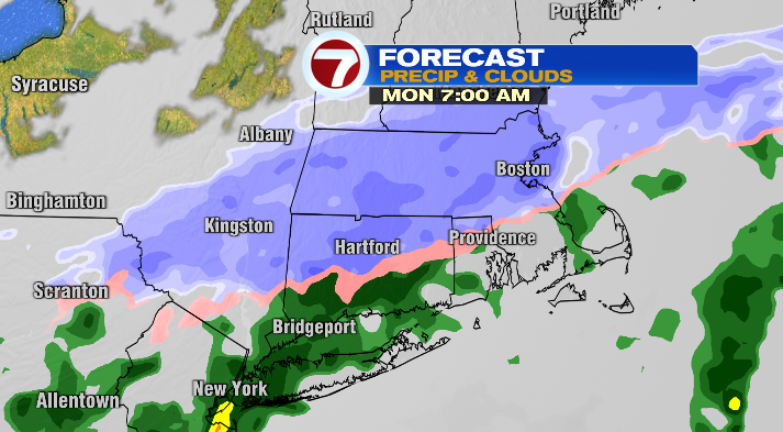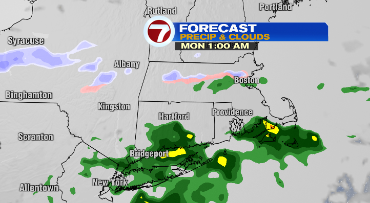 Precipitation returns with showers, and eventually more rain close to midnight. From there, we’ll transition to a wintry mix and some snow showers as this storm tapers off mid-morning on Monday.