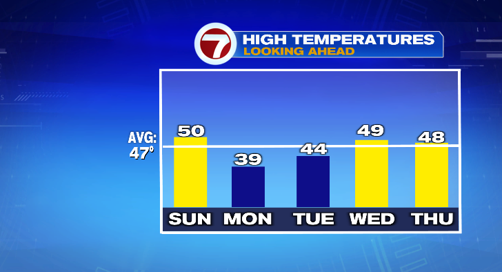Once the storm is out of our hair, we tumble back into a short-lived cooler trend. Highs on Monday will be in the upper 30s. Tuesday, while mostly sunny, will be in the mid 40s (a few degrees below average). Temperatures will climb back to the upper 40s on Wednesday with more clouds around. We may see a spotty shower on Wednesday as well, though most of the day stays dry.