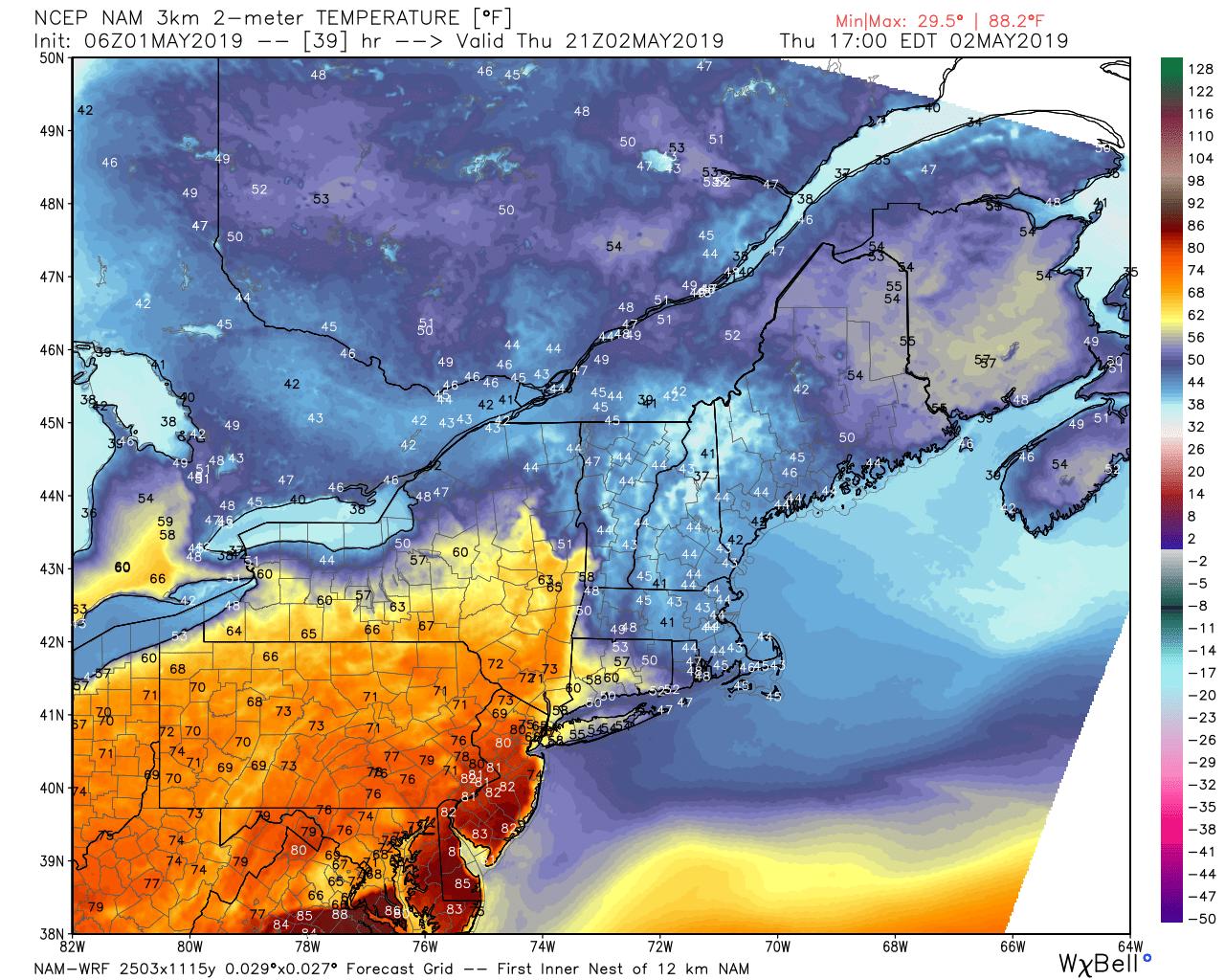 While we’re stuck in the 40s tomorrow afternoon, check out the temps in New Jersey! Temps there will warm into the 80s. Often this time of year, there can be a huge range from eastern New England to New York City or Philly, tomorrow will be one of those days. So close, yet so far away!