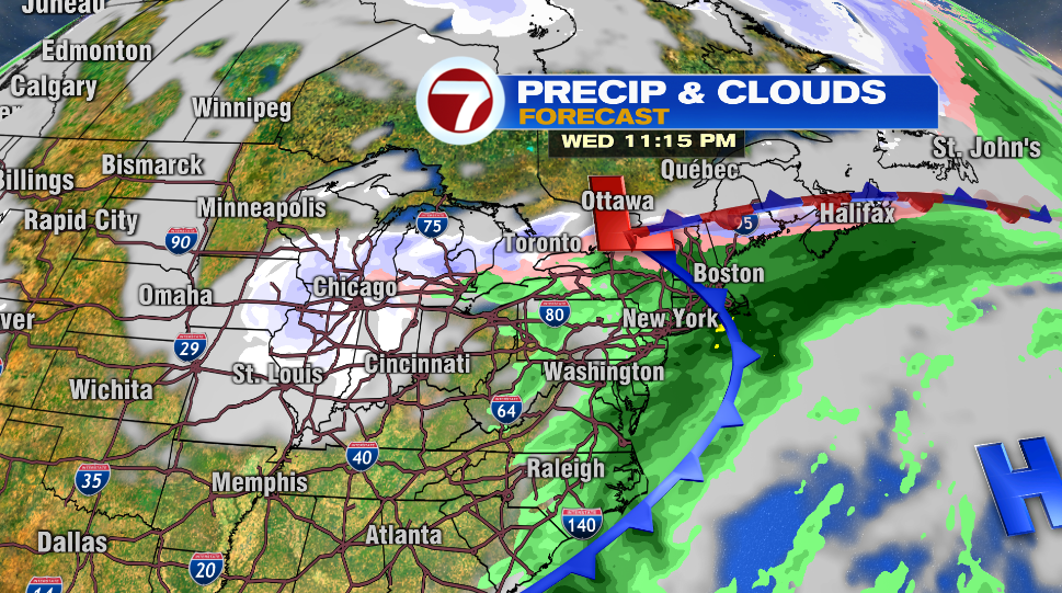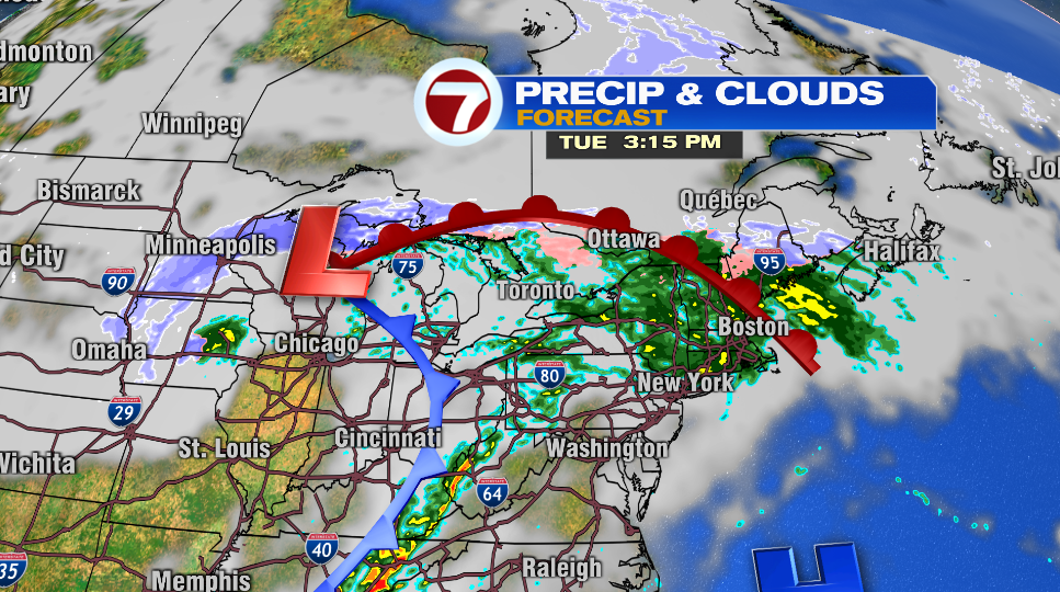 We will see rain from this system twice, first with a warm front Tuesday evening, then a cold front on Wednesday. Once the cold front passes by, temperatures will drop significantly, with seasonable conditions returning late week and into the weekend.