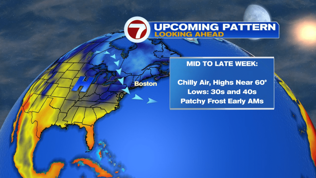The mid to late week pattern is cool, but dry with lows in the 30s and 40s and highs near 60. Patchy frost across the interior is likely Wednesday, Thursday, and Friday mornings. It’ll be milder Saturday with highs near 70.