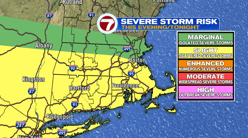 The heat and humidity roared back in full force today with temperatures reaching the 90s for most of us and the humidity making it feel like the middle 90s this afternoon. We had more clouds out there today which were blown off of storms to our west. Eventually those storms will arrive here in southern New England. We could see an isolated storm until about 7 or 8pm and then they become more widespread after that. We’ll have scattered showers and thunderstorms overnight, but they will (mostly) be gone by tomorrow morning… though a lingering shower is possible until about 7am.