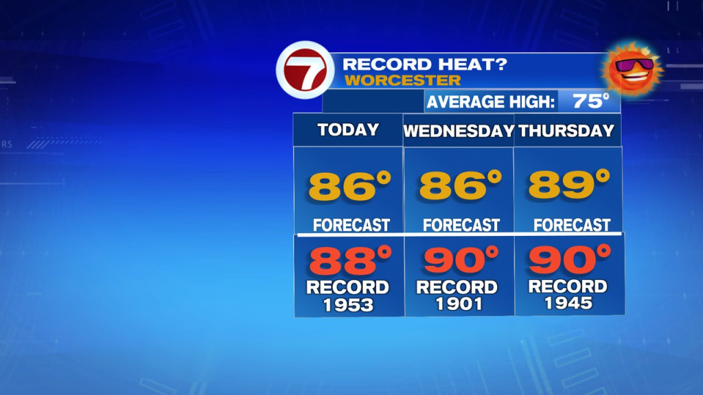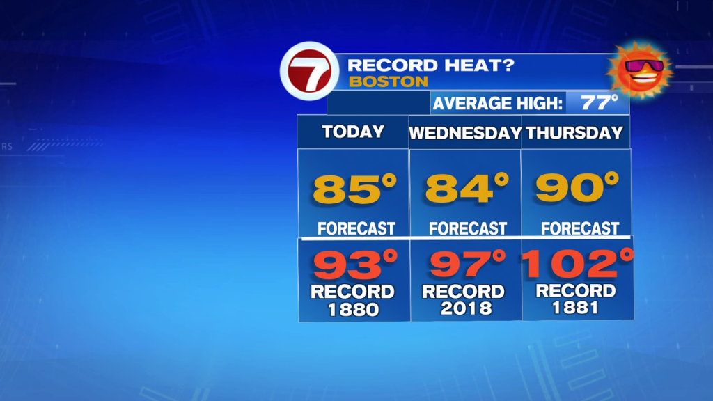 The heat peaks for many of us Thursday with highs 90-94. That’s when Boston will have the best chance of hitting 90 since the sea breeze likely keeps it below 90 today and tomorrow. The best chance of nearing records will be inland too over the next few days. Worcester will be very close to tying the record today and Thursday. Boston’s record on Thursday to beat is 102 set in 1881! So even at 90, we won’t be close. Humidity remains high through the week. Scattered shower and storms start to pop this weekend, with the highest chance inland late Friday and Saturday afternoons.