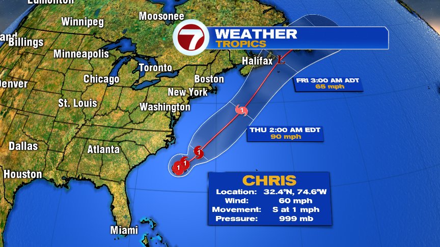 In the tropics, we’ll track Chris, which will likely become a hurricane later today or tonight. Chris passes a few hundred miles to the southeast of us. That path keeps the heavy rain and strong winds offshore, but will kick up the seas and surf. For east and south facing shores, watch for rip current and rough surf potential Wednesday and Thursday.