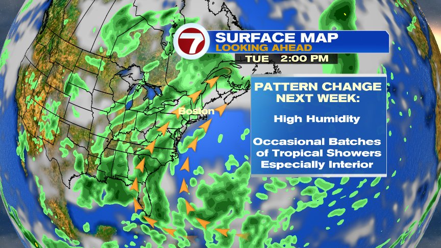 Sky high humidity lasts through next week with occasional downpours possible. As the Atlantic ridge flexes it’s muscles, it’s possible that on a few days next week, the highest rain chances stay across the deep interior of New England, yielding mainly dry, yet humid days for us. When fronts/disturbances do slide in, they will be capable of producing downpours. Something worth watching next week and we’ll time out day to day specifics as we get closer.