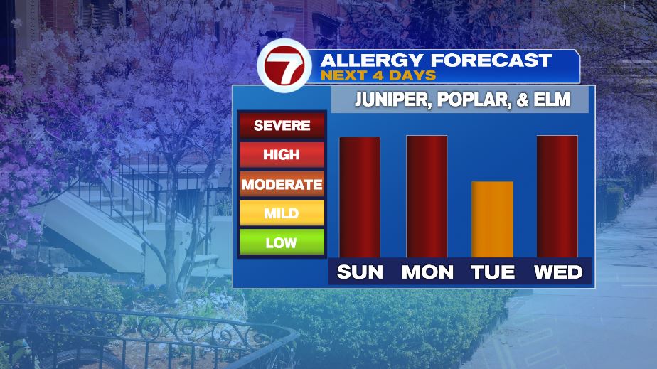 The allergy forecast is severe the next two days. Tuesday will start severe, and then it drops in the afternoon with the rain moving in.