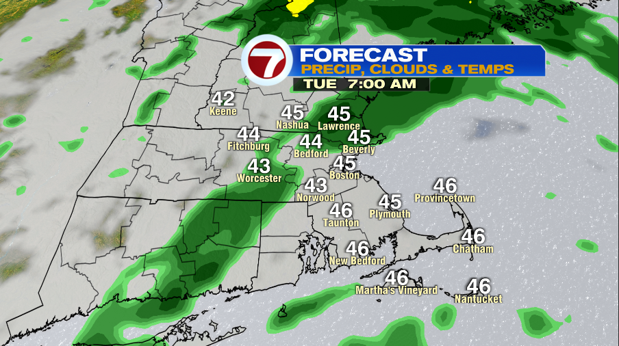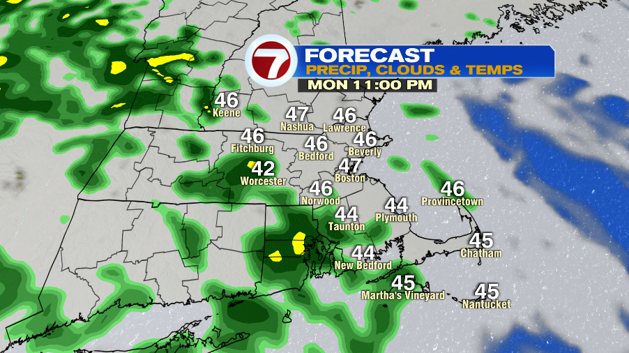 Showers arrive Monday night after 10PM. Expect light, on and off shower overnight and into early Tuesday morning.