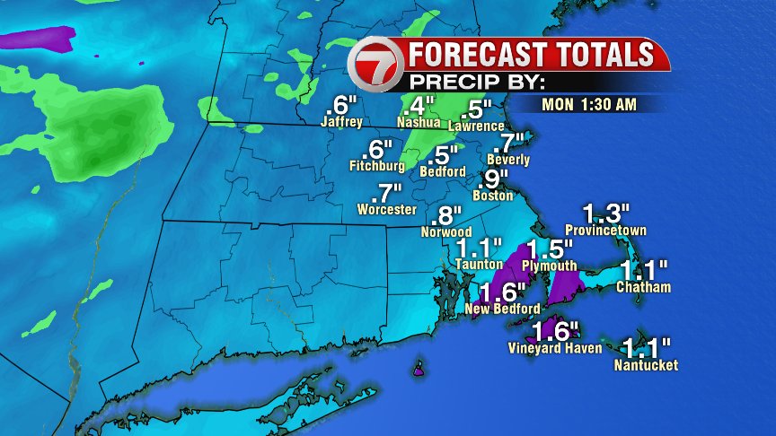 Rain totals run 0.5-1.0″ with locally up to 1.5″ across far Southeast Mass. Rain wraps up around 2-3am, so it’ll be long gone by the time the Monday morning commute gets going. That’s if everyone doesn’t call out sick tomorrow :-), cough, cough.