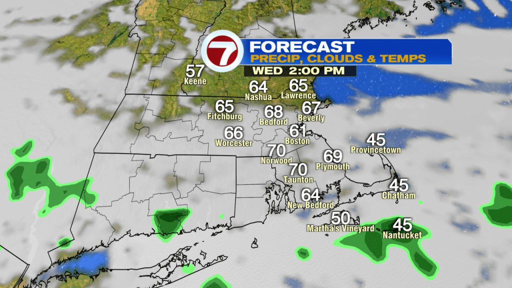This morning, we go back the other way as the west to southwest wind kicks in. Temps warm into the 60s to lower 70s by mid afternoon. While a few spotty showers will be in the mix, we’ll also catch a few breaks of sun. Late-day winds do go back to the northeast, and we’ll start dropping the temps again from east to west.