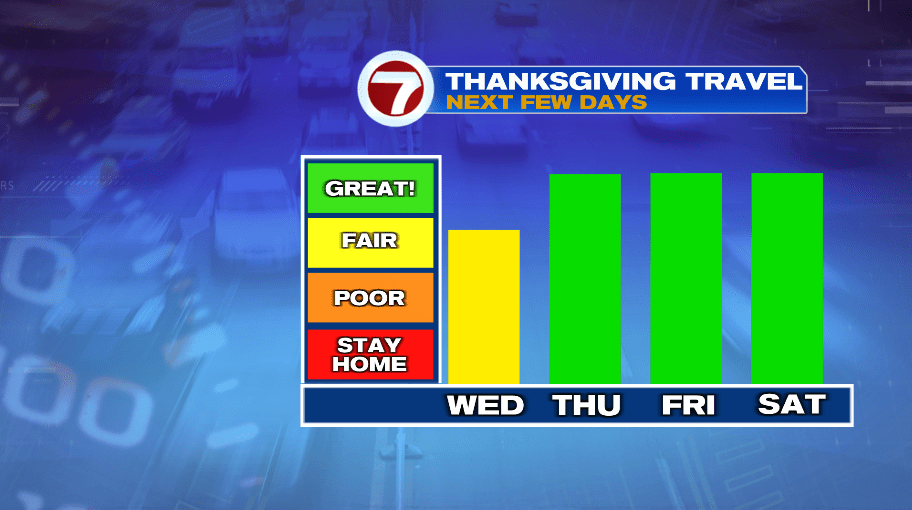 Once we get behind the showers today, drier air will fill in for Thanksgiving and into the weekend. The trade off will be colder temperatures, so say goodbye to the near 60° numbers we’ll have today. The colder air will push in on the heels of a gusty wind the next few days. Today the wind isn’t bad, but it’ll start to pick up Thursday for Thanksgiving, with the peak of the wind arriving Friday.