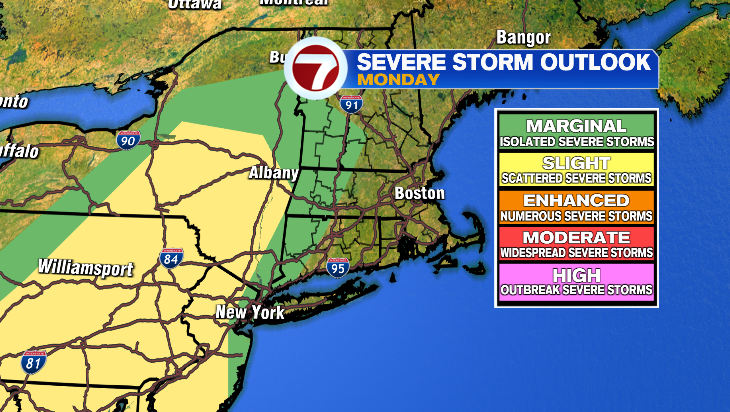 Although there is a severe thunderstorm risk in western Massachusetts, we’re not expecting severe storms in eastern New England at this time.