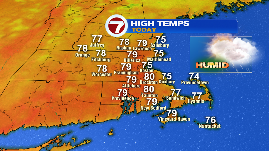Rain and humidity returned overnight and will be with us for the next few days. Now, it won’t be raining nonstop through Thursday, but we will have scattered showers around through Thursday. Today, the steadiest and heaviest rain is falling this morning, and it will taper off dramatically after 8am. For the rest of the day, a spotty shower is still possible, but the chance of rain drops to about a 20 or 30% through much of the day. With the drier hours today and even a glimpse at the sun, temperatures will fare alright, climbing to the upper 70s for most. You’ll also notice the tropical humidity back in the air.