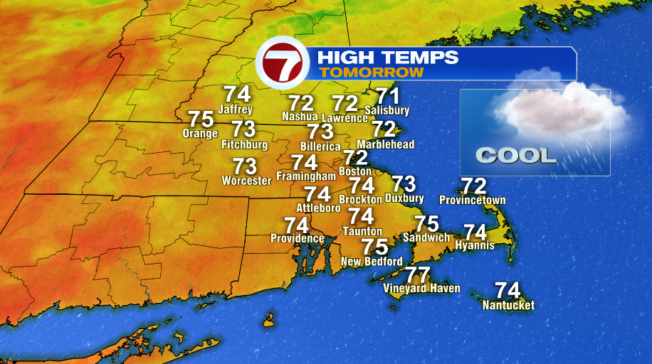 Tomorrow is a cooler and cloudy day, but it will still be very humid, so while cool not really chilly — if that makes sense. Clouds will hold tight, we’ll have an onshore wind and scattered showers so temperatures will struggle to make much progress through the afternoon.