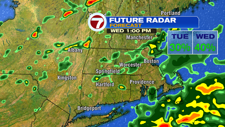 The rain chances tomorrow will be a bit higher than today, with again the wettest areas going to southeast Massachusetts, Cape & Islands. It’s not an all day rain, but scattered showers will be with us through much of your Wednesday.