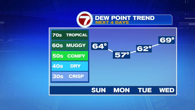 Monday and Tuesday feature more seasonable highs into the low 80s (and lower dewpoints) before we turn towards the heat and humidity to end the week.