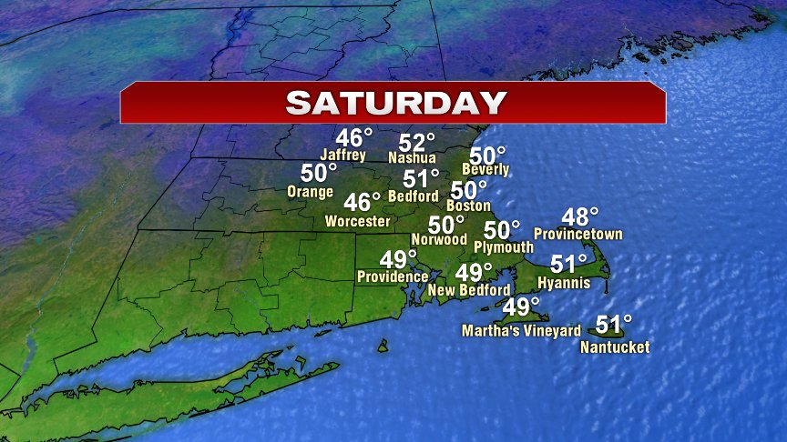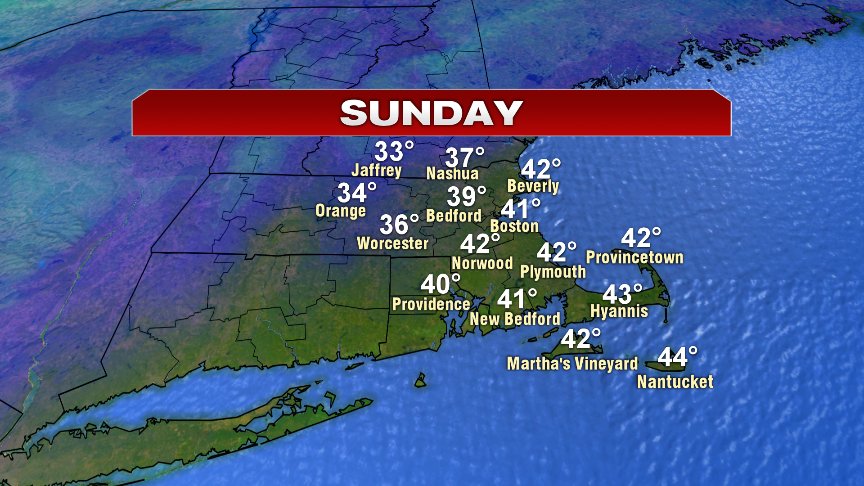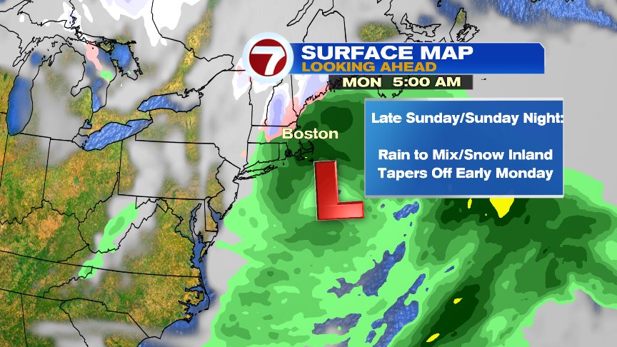 Sunday does turn much cooler again as winds are out of the north, allowing for a chillier air mass to return. From our south, showers likely return by the afternoon too, with the highest risk of snow/sleet mixing in, across the deep interior of New England. Although, by Sunday evening and overnight, mainly towns/cities along and near 495 may flip to a mix of sleet and snow for a bit, before the storm tapers off early Monday. Winds get gusty later Monday and especially Tuesday as cold air crashes back in.