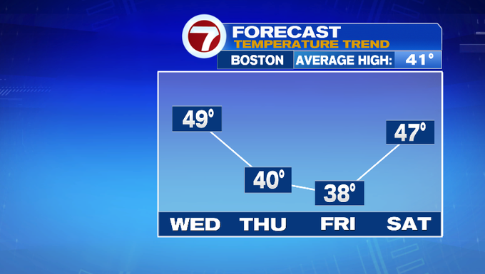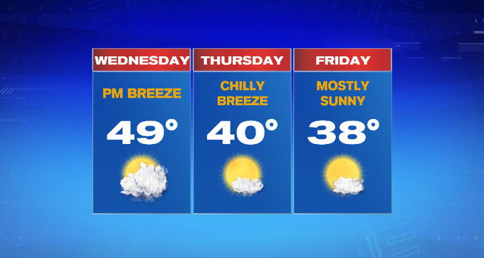 Slightly cooler temperatures (closer to normal for this time of year) returns for the end of the week. A chilly breeze accompanies the highs near 40° tomorrow, upper 30s Friday, with both days featuring mostly sunny skies.