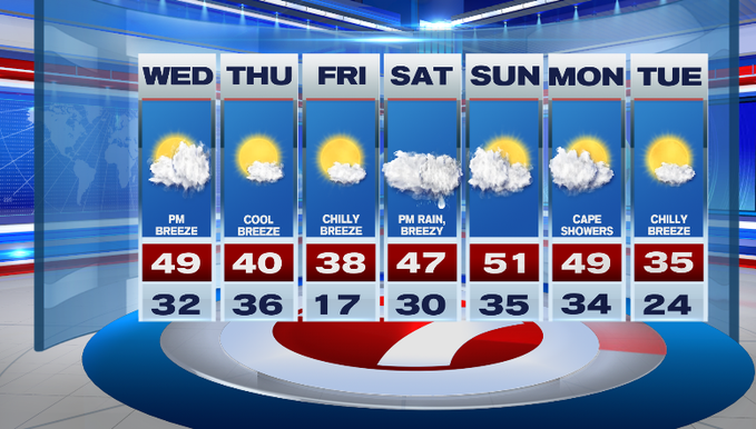 The warmth sticks around for Monday under mostly to partly cloudy skies and a chance for some showers for the Cape followed by a cool-down for Tuesday with highs in the 30s.