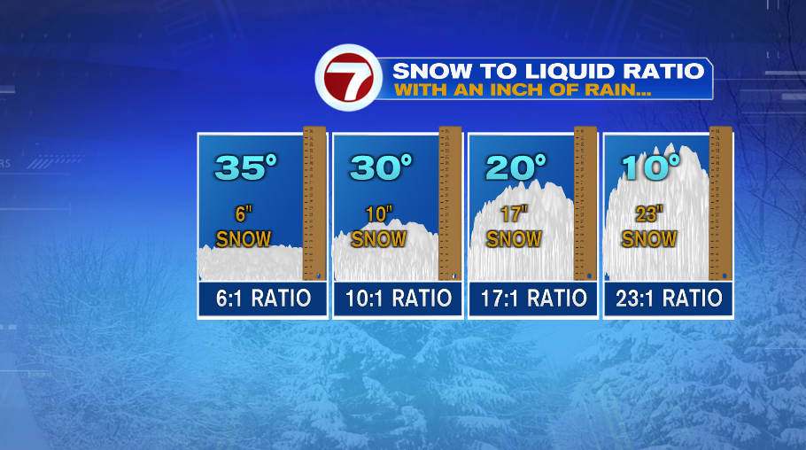In a typical winter storm (liken it to an average, say), snow falls roughly at a 10:1 ratio. That’s often the case with temperatures near freezing. What that means is 1″ of rain can produce 10″ of snow. The warmer the air, the lower the ratio. So if the temperature was 35°, that same storm may produce snow at a 5:1 ratio, meaning that same 1″ of rain can only produce 5″ of snow.