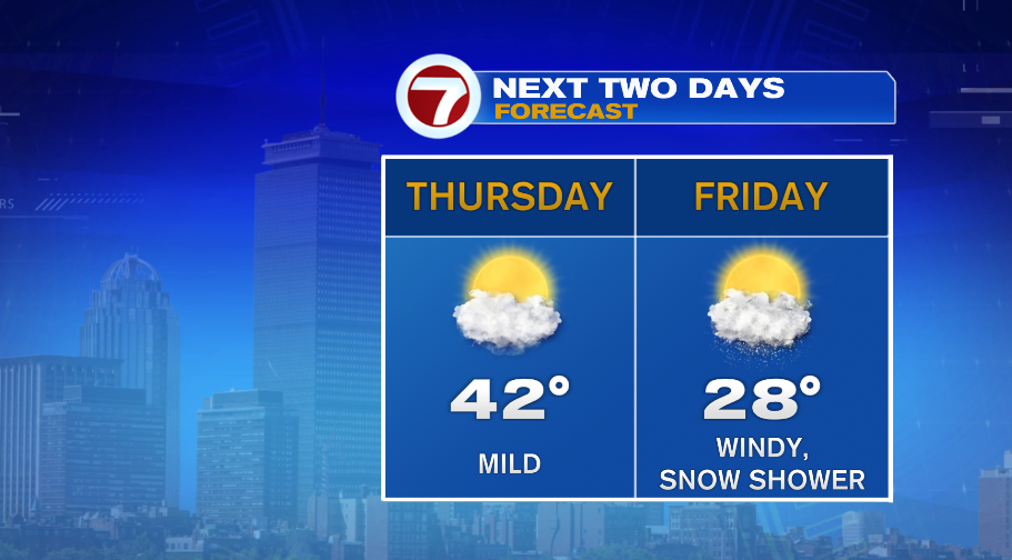 These snow showers are actually on a warm front that will move through overnight. So while we spend most of the day in the 20s today, we’ll keep our temperatures climbing overnight, so today’s actual high temperature will be at midnight — somewhere around 32°. The temperatures will keep on climbing into the day tomorrow and give us a pretty nice day on Thursday. We’ll have partly cloudy skies and temperatures that make it back to the lower 40s. That’s pretty nice for January, when our average high temperature is now just 36°. As quick as the warmer air arrives, it will move out. An arctic front will move through on Friday, dropping our temperatures, kicking up the wind, and producing a few passing snow showers through the day. The bigger impacts from this arctic front will be felt Friday night and Saturday.