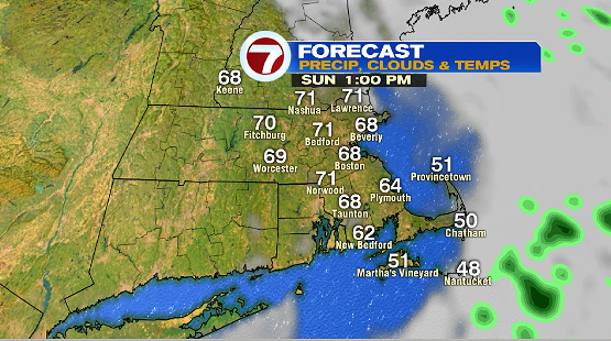 Sunday, besides that spot sprinkle chance in the morning, we’re looking at partly cloudy skies and highs slightly warmer than Saturday. We’re talking highs near or just above 70 inland, upper 60s at the coast.