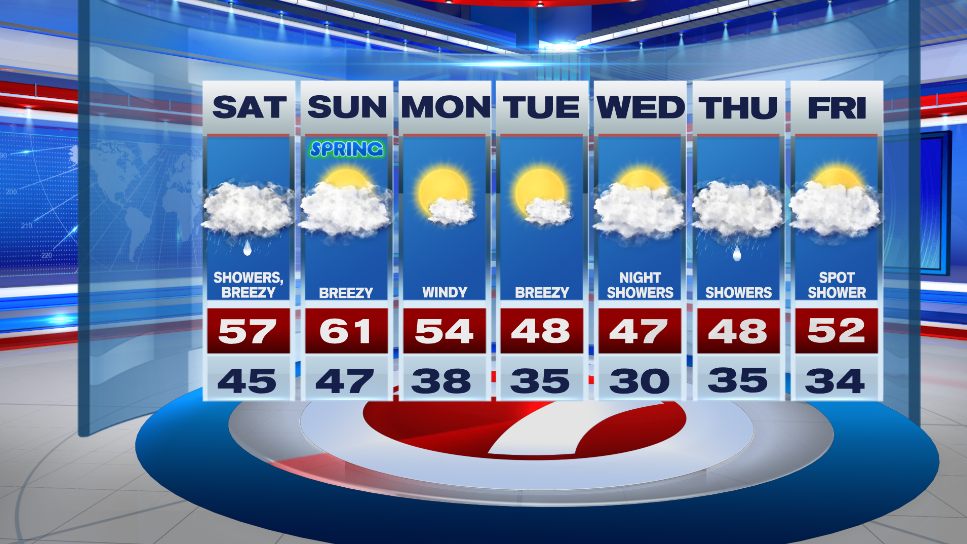 Sunshine returns on Monday, but it’s also windy. Highs reach into the mid 50s.