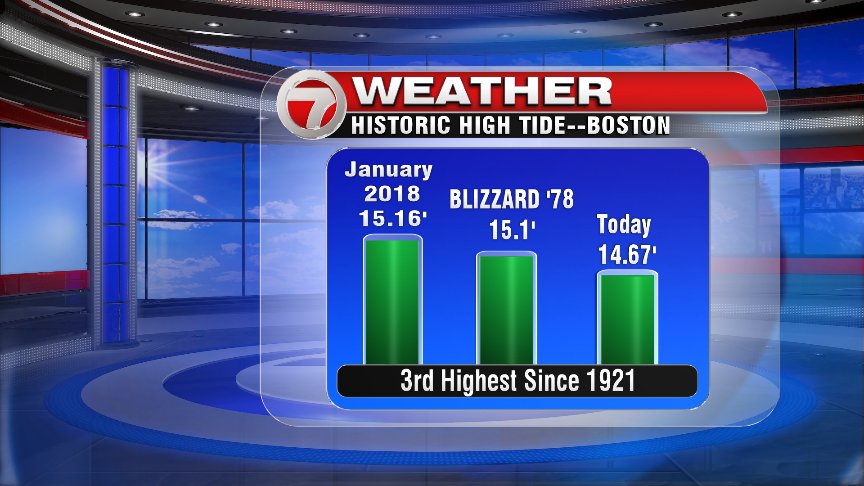 How about that mid-day high tide? Currently sitting at the 3rd highest on record for Boston… but we do expect that tonight’s high tide (around midnight) will be higher than mid-day today: