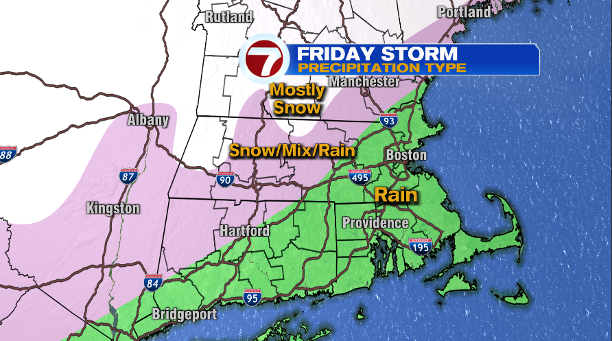 The clouds rolled in today, making for a very gray day and now the precipitation will follow. If you look at the 7Weather Interactive Radar, it *LOOKS* like the rain and snow will start any minute. But the storm has a ton of dry air to overcome so it’ll take some time before the precipitation starts here in southern New England. Unfortunately for snow lovers, this is not the storm for you. An east wind will pull in the “warm” ocean air and cut out the snow potential for most of us. Inside of 495 expect rain the entire storm. It may end early Saturday morning as a few rogue snowflakes or a brief snow shower but it’s all about the rain. Outside of 495 it’ll be back and forth between rain and snow, but even there it’s probably more rain than snow and thus cutting down on totals. The highest elevations will hold onto the snow for all or most of the event so that’s where the more significant accumulations will occur.
