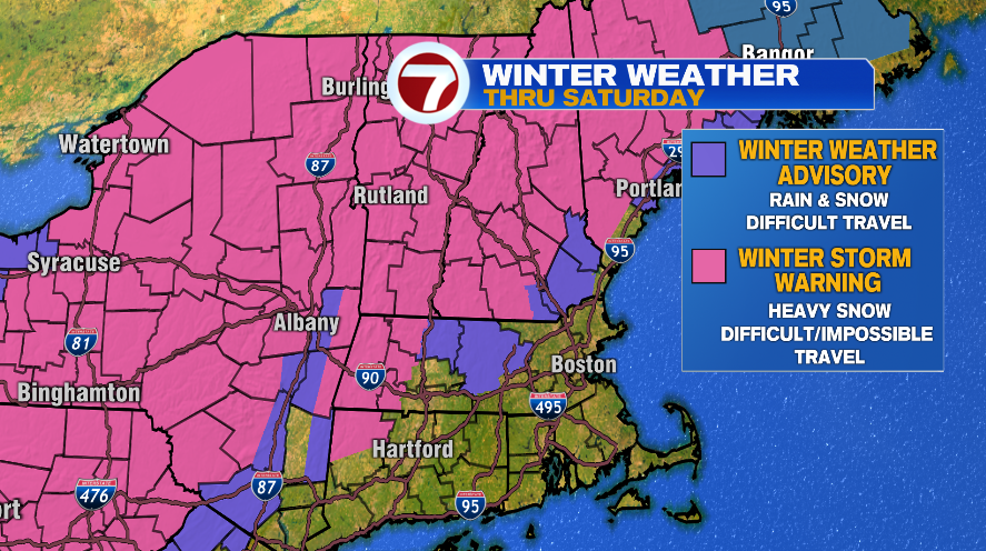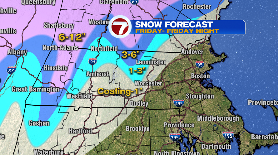 Locally, we have a winter weather advisory in effect for Northern Worcester County and Rockingham County in New Hampshire (excluding the Sea Coast). The winter weather advisory is less about high snow accumulations and more about slow and difficult travel as the rain and snow flip back and forth and lead to slushy coatings on the roadways. The elevations, where more snow is expected, are upgraded to a winter storm warning. Not only for a lot of snow, but a heavy wet snow. Travel here could be difficult to near impossible Friday and Saturday. Notice it extends all the way into Northern New England. Ski County is going to make out great with this storm. In fact many of the peaks there are expecting at least a foot of snow.