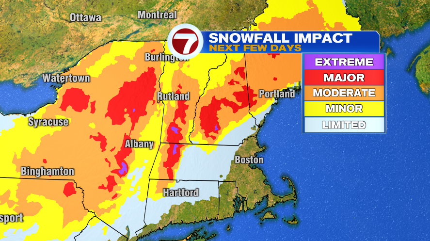 The graphic below aims to highlight areas most impacted by the snow. Look how much the impact changes from “limited” impacts in Worcester County to “major” and even pockets of “extreme” in the White and Green Mountains. So while Ski Country is going to get a lot of snow and make for great skiing over the next few days, getting there could be a real struggle and something to really consider if you were planning on driving to go skiing either Friday or Saturday.