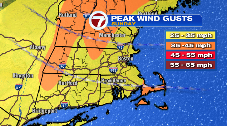 Sunday afternoon gusts could reach 35mph for most of the area, with some isolated areas (higher terrain & cape) seeing gusts to 50mph.