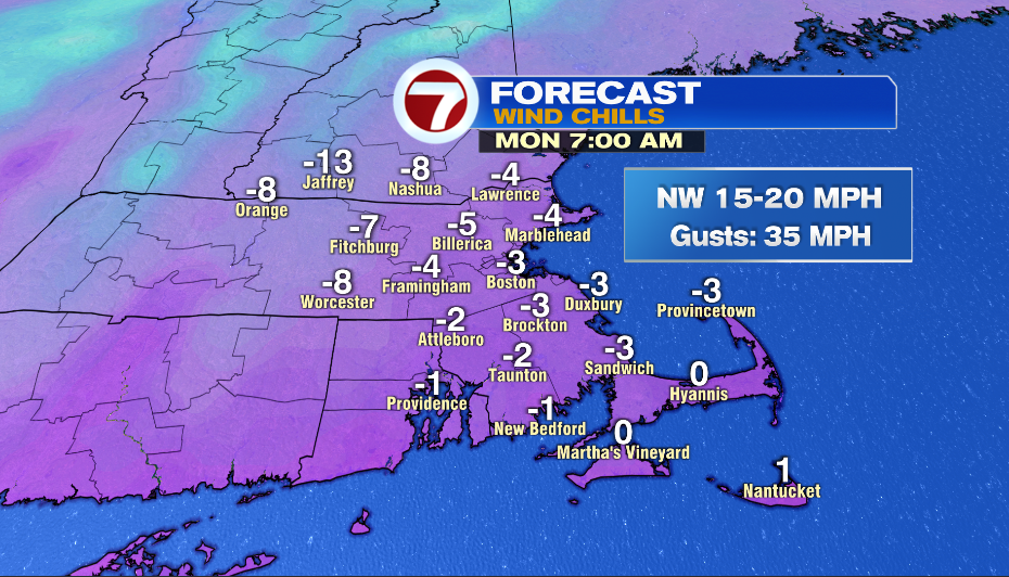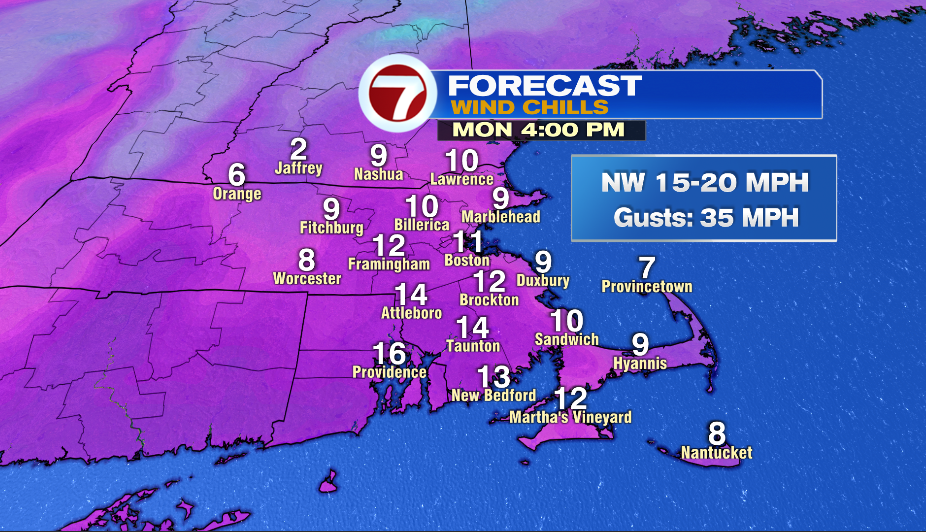 A Wind Advisory remains in effect for the entire state of Massachusetts until midnight for gusts between 45-50 mph. It will still be windy after midnight and into tomorrow, but gusts will be a bit lower at 35-40 mph. It will be very cold tonight with lows in the teens, and wind chills near 0º.