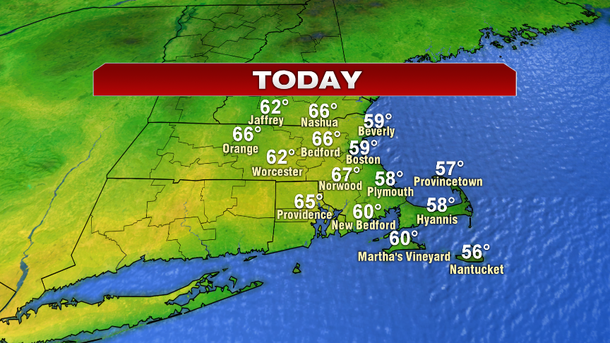 Today, we don’t have to worry about water on the ball fields or rain drops on the burgers and dogs on the grill, but it will be a bit cooler. As sea breezes kick in, coastal temps fade from the low 60s, back into the 50s. Inland temps are solid though, running in the mid to upper 60s.