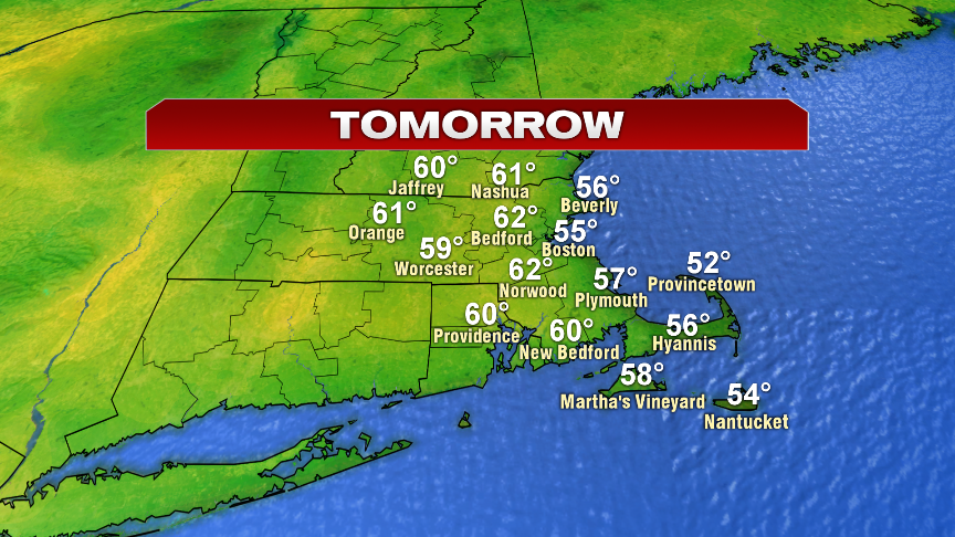 Tomorrow, clouds increase during the afternoon. Temps slip back again too. Mid 50s coast, low 60s inland.