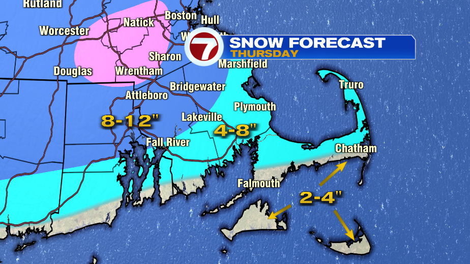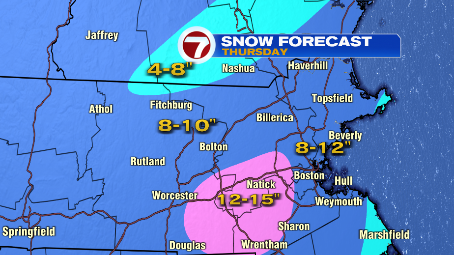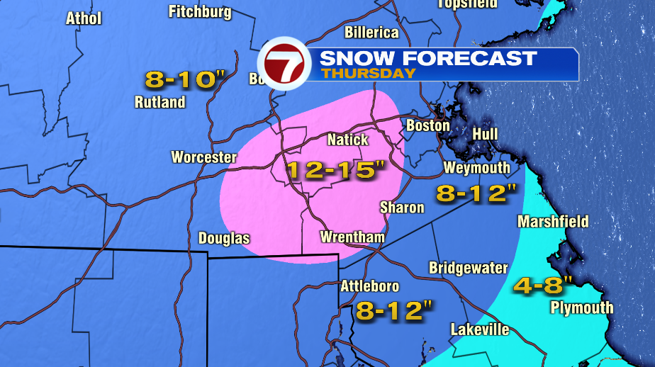 Expect an area of widespread 8 to 12”of snow for much of the region (area in dark blue on the snow map below). Some locations west and south of Boston could see over a foot of snow with heavier bands of snow.