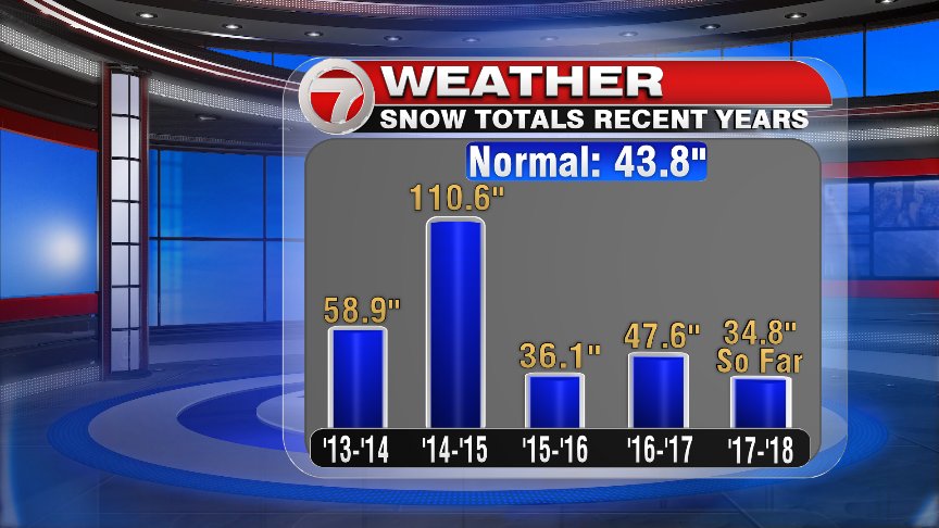 This may have some of you scratching your heads and thinking… “but we haven’t seen a lot of snow this year, have we?” I’ve been seeing that common thought on Twitter… I think many people think of SNOW as coming along with the real big blockbusters that we can often get around the area. We haven’t had a lot of blockbuster storms this year. Really, the only BIG snow (6″+) was back on January 4th when Boston picked up 13.4″. But a few inches here, a couple there… it does all add up – especially when that tally starts in December.