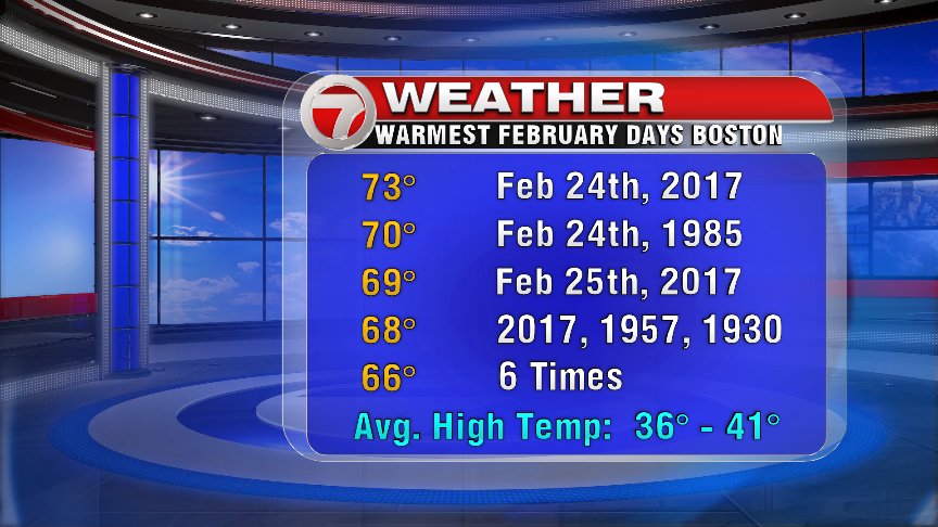 Now that we’ve covered the cold and the snow – we’ll change gears to talk about February warmth… because we’re in for some in the next couple of days. Tomorrow it’s into the low 60s and for Wednesday, we’ll be flirting with 70°. You can see by the graphic below that 70°+ in February doesn’t happen that often; only twice on record! Last year’s 73° on February 24th was the warmest temp ever recorded in Boston during the month of February.